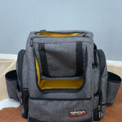 Innova frisbeegolfreppu ja useita frisbeegolfkiekkoja. Reppu on selkämallinen ja siinä on tila usealle kiekolle, jotka sijoitetaan etuosan lokeroon. Kiekot ovat melkein uusia sopii aloittelijoille👍