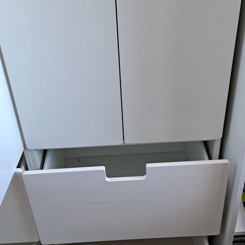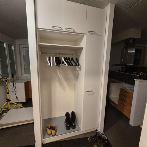 Pariovien takana vaatetanko ja yksinäisen oven takana hyllyt.