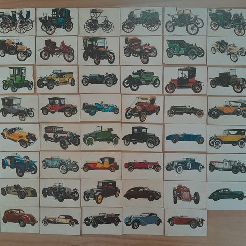Keräilykortit vanhat autot. Korttien kuvissa on erilaisia vanhoja automalleja. Sopivat esimerkiksi keräilyyn, askarteluun tai sisustukselliseen käyttöön, kuten kehyksiin tai kokoelmakansioon laitettaviksi.
