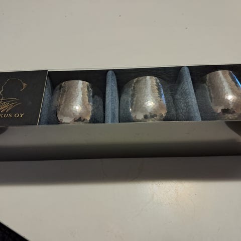 Materiaali kuparia, sisäpinnat hopeoitu ja kahva sekä kannen nuppi teakia...