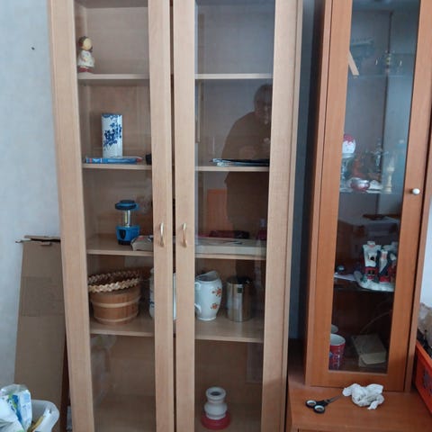 Myydään hyväkuntoinen lasivitriini, korkeus 198 cm, leveys 88,5 cm, syvyys 42,5 cm.