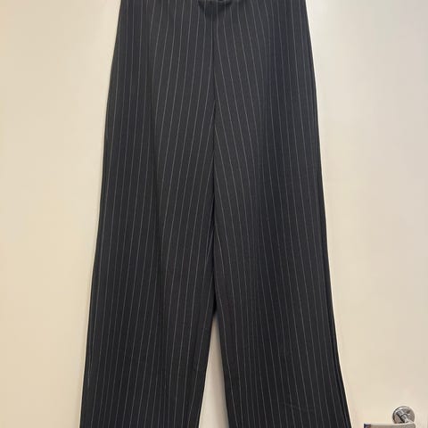 Korkeavyötäröiset tvillihousut, joiden toisessa sivussa piilovetoketju ja hakaset. Huomaamattomat sivutaskut. Väljät lahkeet, joissa prässi edessä ja takana.
