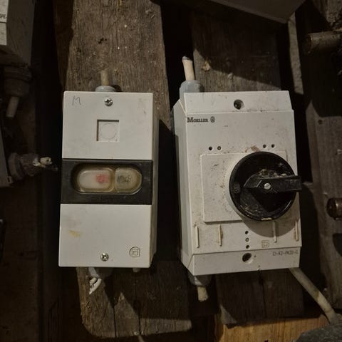 Moottorinsuojakytkimiä / virtakytkimiä esim. 3-vaihe moottoreille. Toisissa kytkimissä vipu toisisaa nappulat.
