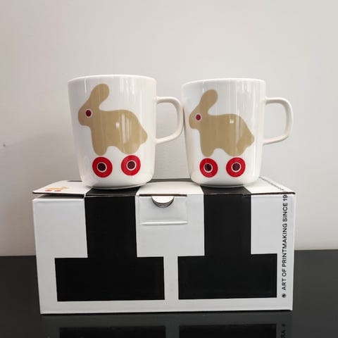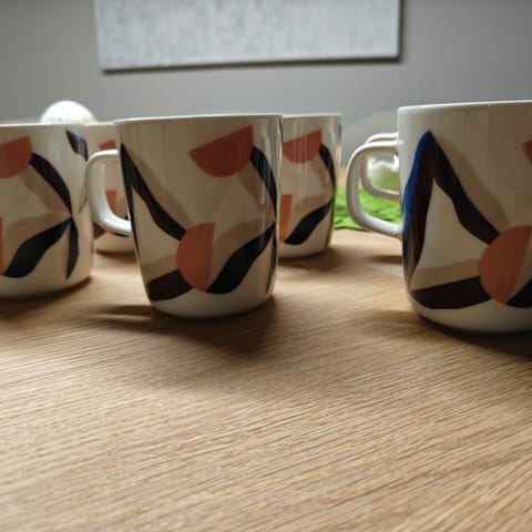 Marimekko Oiva "Rulla" mukit, 4 kpl. Pohjassa merkintä: New Year 2023. Vähän käytetyt / hyväkuntoiset mukit, yhden hinta 20 e. Toimitus: nouto tai lähetys