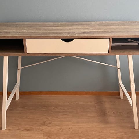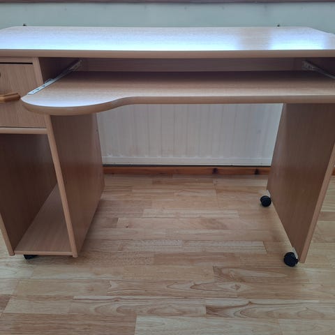 Kulmaan sopiva työpöytä, laatikostoja ja avohyllyä. Siiskuntoinen.