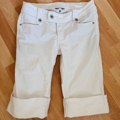 Todella vähän käytetyt shortsit. Beiget, joissa ohuet valkoiset raidat. Nappi ja vetoketju kiinnitys. Hyvän kokoiset etutaskut.