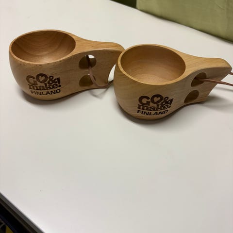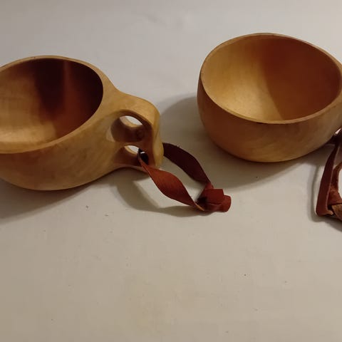 Puinen kuksa juomakuppi vaaleasta puusta. Kuppi on yhdestä puukappaleesta veistetty ja siinä on pyöreä, syvä kuppiosa. Kahvassa on nahkanyöri ripustamista tai kiinnittämistä varten. Sopii esimerkiksi juomakupiksi retkille, vaelluksille tai mökille.