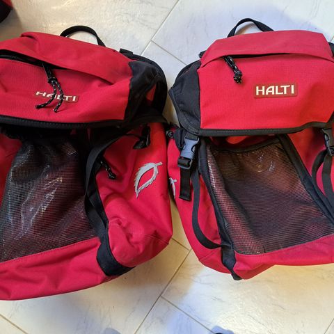 Mukana tulleet olkahihnat voin vähän turhakkeiksi, eli ne on otettu pois. Jos satun ne löytämään niin ne saa toki myös mukaan. Itse myös varmuuden vuoksi varmistin kiinnityksen tarakkaan irrotettavilla "kestonippusiteillä." Laukuissa näkyy kulumaa, eli eivät uudenveroiset.