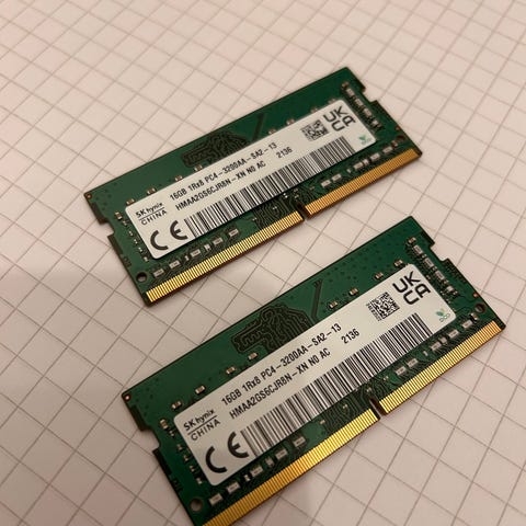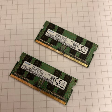 Myydään kaksi 16GB DDR4 SO-DIMM muistikampaa (yhteensä 32GB). Kammat ovat eri valmistajilta (Samsung ja Crucial), mutta teknisiltä ominaisuuksiltaan identtiset, joten ne toimivat erinomaisesti yhdessä.
