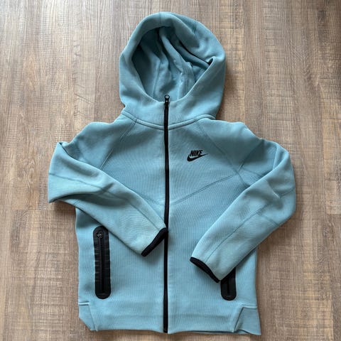 Nike Tech Fleece harmaa huppari kokoa lasten M 137-147cm. Tarkemmassa tarkastelussa huomaa pintakankaassa esim vetskarin ylä- ja alapäässä pintakankaassa kulumaa sekä edessä vetskarin vieressä pieni kuluma/"silmäpako".