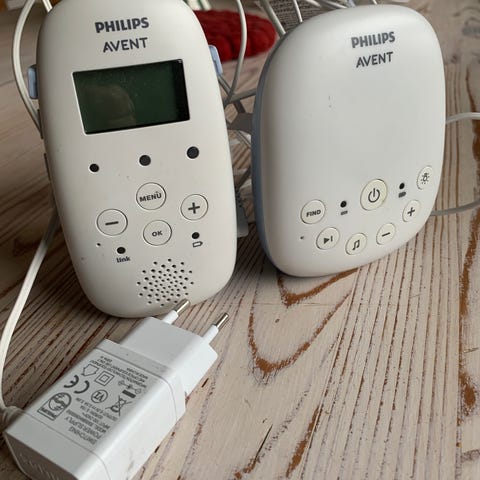 Philips itkuhälytin kahdella yksiköllä ja virtalähteillä. Pakettiin kuuluu vanhemman yksikkö, lapsen yksikkö sekä kaksi Philips‑verkkolaitetta. Laitteissa on äänenvoimakkuuden säätö ja erilaisia painikkeita toimintoja varten.