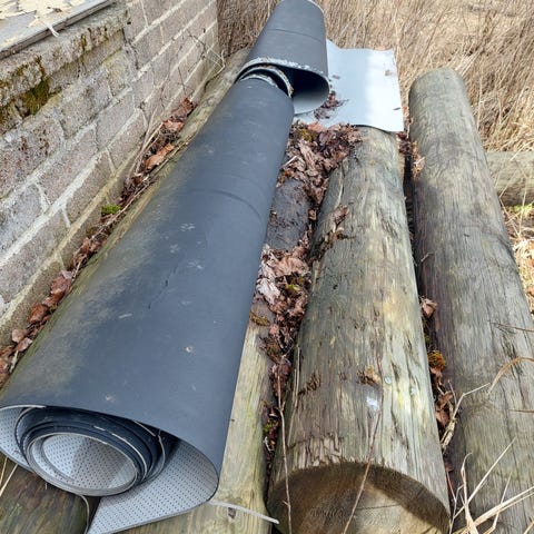 Muovisia valkoisia mattoja. Matoissa on kynnysmattomainen, rei’itetty pinta. Näitä mattoja on pahvilaatikkotolkulla täysin käyttämättömiä eli sadoittain. Hanska skaalana.