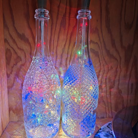 Pullovalot. Valonauha tulee pullon sisään ja korkki pullon korkiksi. 2 valot palaa, yhteen pitää vaihtaa paristot. Tunnelmalliset himmeät ledit, pimeässä näkyy, valot päällä ei meinaa erottaa, että valot palaa.