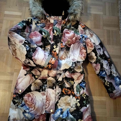 Molo lasten takki, koko 146 - 152 cm. Materiaali polyesteriä, sisäpuolella verkkovuori. Takissa on vetoketjukiinnitys edessä, joustavat hihansuut ja helmassa kuminauhakiristys. Hupullinen malli, selkäpuolella heijastintähti. Soveltuu arkeen ja ulkoiluun lapselle, jonka pituus on noin 150 cm.