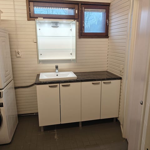 Kylpyhuoneen musta allaskaappi. Päällä allas kiinni ja sisällä hajulukko. Hieman käytönjälkiä alemman oven päällä sekä oikealla reunalla (katso kuvat).