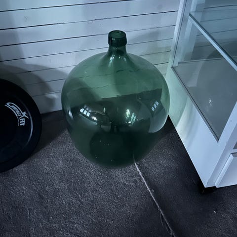 Kaksi lasista pulloa, jotka soveltuvat maljakoiksi tai muuten vaan koristeeksi. Paksumman pullon merkkinä John Harvey, toisen pohjassa ei lue. Lisäksi paksun pullon pohjalla vielä puinen korkki sisällä.