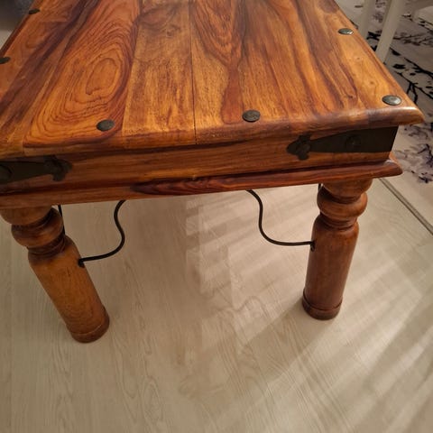 Kaunis acazia sarjan eteispöytä. Jalkoja hieman madallettu. Pöydän kannen liimapuu hieman irvistää. Ed mainitut huomioitu hinnassa.