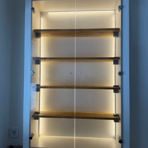 Valkoinen ovi, jossa lasi- tai lasimainen pinta ja metallirunko. Ovet 4kpl soveltuu kaapin oveksi. Ylä- ja alareunassa on metalliset liukukiinnikkeet.