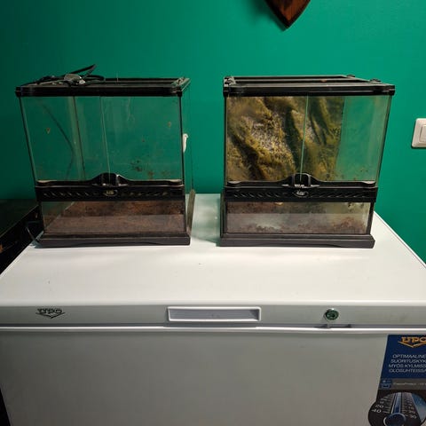 Kuusi vuotta vanha, joten kunto ei enää vastaa uutta. Siitä huolimatta terraario on ehjä ja yleisilmeeltään siisti. Silikonit eivät varmaan enää pidä vettä, mutta sopii silti kostealle pohjamateriaalille.
