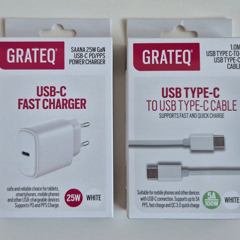 Pieni ja turvallinen verkkovirtalaturi USB-C-latausportilla.