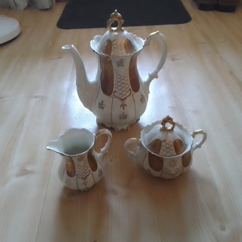 Posliininen teekannu- ja tarjoilusetti, jossa moniosainen kannu ja suuri lautanen. Valkoisella pohjalla monivärinen ruusukuviointi vaaleanpunaisen ja vihreän sävyissä sekä kultareunus. Sopii teen tai muiden kuumien juomien tarjoiluun sekä koristekäyttöön. Pohjassa valmistajan merkintä.