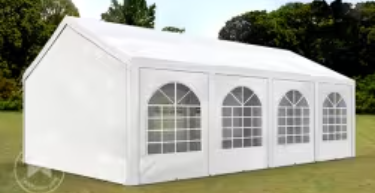 Valkoinen juhlateltta, jossa sivuilla ikkunalliset seinät. Mitat 3x6M.