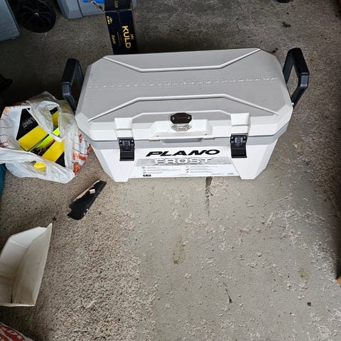 Styrox-kylmälaukku kantokahvalla. Laukku on valmistettu vaahtomuovisesta styrox-materiaalista, jossa on sinisiä pilkkuja. Kylmälaukussa on irrotettava kansi ja yläosassa muovinen kantokahva kuljettamista varten. Sopii elintarvikkeiden ja juomien kylmänä pitämiseen esimerkiksi retkillä, piknikeillä tai matkalla.