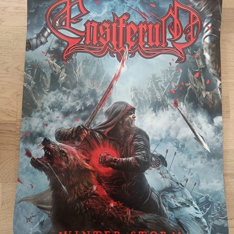 Myynnissä näyttävä Ensiferum Unsung Heroes -aiheinen seinälippu / kangasjuliste. Koko 100 × 150 cm (leveys × korkeus).
