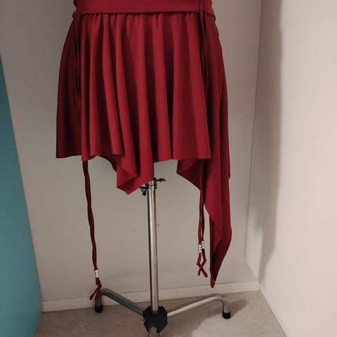 Sadien hame, jossa päällä musta tylli ja alla sileä punainen kangas. Vyötärönä musta kuminauha, jossa hiukan purkaumaa, mutta venyy vielä hyvin. Helmassa musta värjäymä ja muutama langannousu, kenties tanssikengän osumasta, en ole kokeillut tahranpoistoa. Vyötärönympärys noin 70 cm ja venyy ainakin 100 cm. Hinta 4 euroa.