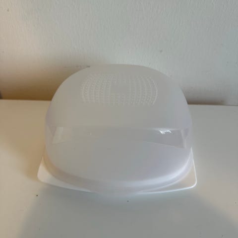 Tupperware iso juustokupu ritiläkannella. Astia on valmistettu muovista ja siinä on rei’itetty kansiosa, joka mahdollistaa ilmanvaihdon.