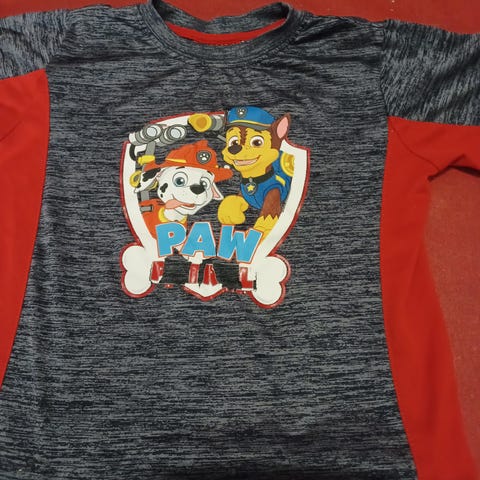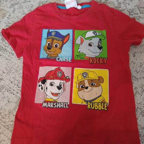 Yhdellä olleet t-paidat, Tuuri 110/116 ja Ryhmä Hau 120 (116 koossa käytetty). Käytettyjä, haalistumaa varmasti ja Ryhmä Haussa selässä reikä ollut alusta lähtien. Yhteensä 1e.