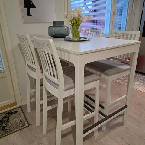 Ikean kahden istuttava korkea ruokapöytä ja kaksi tuolia.