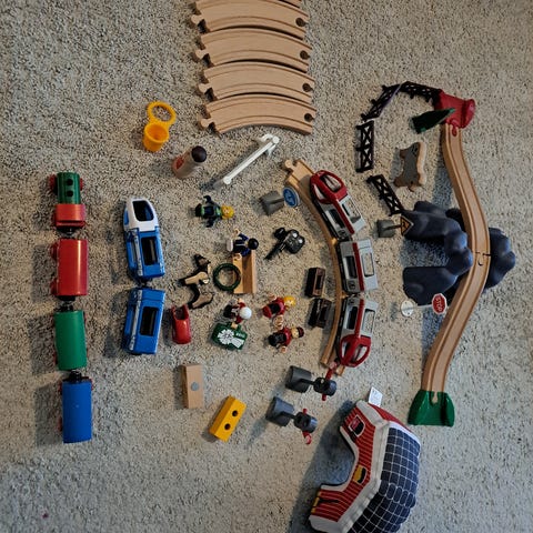 Muovinen leikkijunarata, jossa valkoinen ja keltainen juna sekä useita värikkäitä muovisia ratoja. Settiin kuuluu suoria ja kaarevia kisko-osia eri väreissä sekä pieniä lisäosia, kuten muovisia puita. Soveltuu lasten leikkeihin sisäkäyttöön.