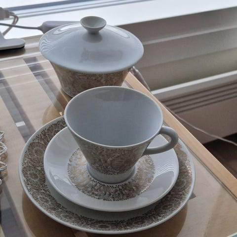 Arabia kuppi ja lautanen, joissa kukkakuviointi. Astiat ovat pääväriltään valkoiset, ja niissä on violetinsävyinen sekä tummempi kuviointi kupin ulkopinnalla ja lautasen reunassa. Sopii esimerkiksi kahvi- tai teekupiksi kattauksiin ja arjen käyttöön. 5kpl