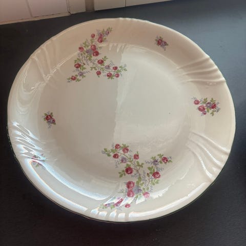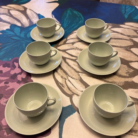 Arabia aluslautanen. Valkoinen lautanen, jossa vihreä lehtikuviointi. Soveltuu esimerkiksi kahvi- tai teekupin aluslautasena käytettäväksi.