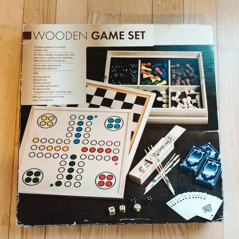 5 in 1 wooden games lautapelisetti. Pakkauksessa on useita puusta valmistettuja klassisia pelejä: shakki, tammi, backgammon, domina ja mikado. Settiin kuuluu pelilauta, puisia nappuloita ja tikkuja sekä suomenkieliset ohjeet.