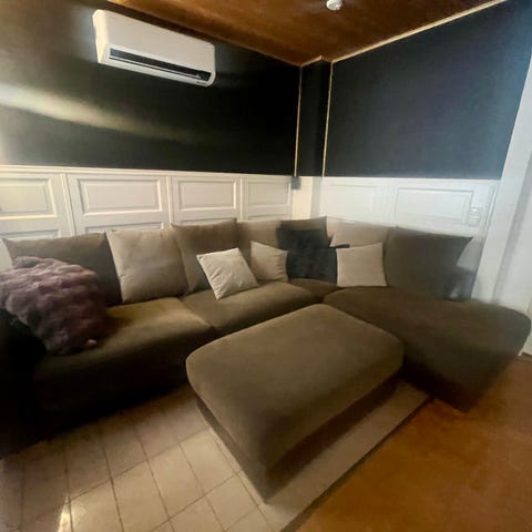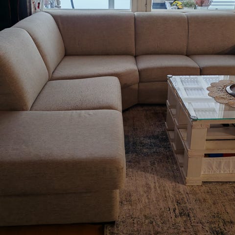 Iso kulmasohva , 220 x 280 cm. Kätisyydet vaihdettavissa. Tukeva istua ja hyvä nukkuakin.