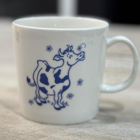 Myyntiin kaksi käyttämätöntä Iloinen lehmä -mukia.