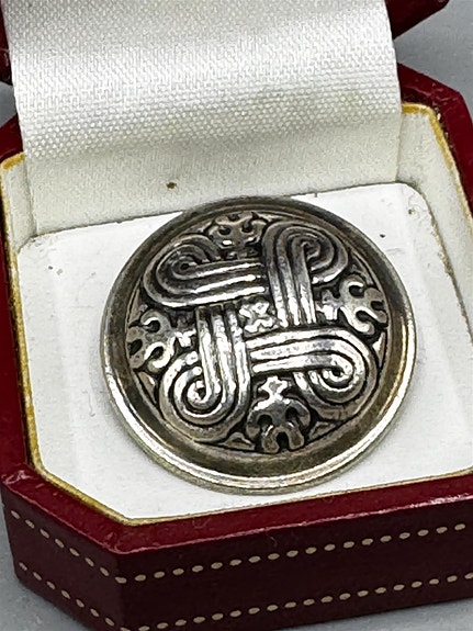 Pieni penkki, jossa on kaarevat jalat ja käsinojat. Istuinosa on verhoiltu vaalealla kankaalla.