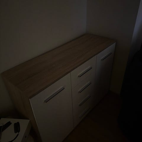 Pyörillä oleva puinen lipasto, jossa kolme laatikkoa ja alhaalla hyllyt. Melko painava, mutta helppo liikutella. Ollut vähän aikaa parvekkeella, (kuitenkin suojassa. )