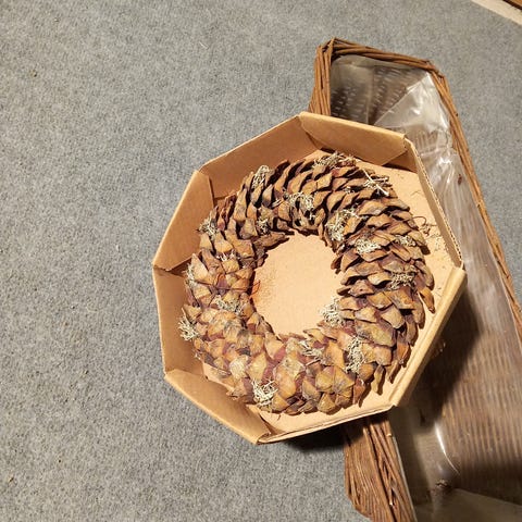 Männyn ja lehtikuusen kävyistä tehty kranssi.