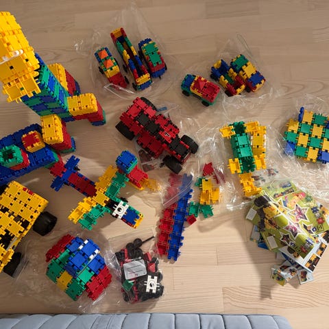 Toisiinsa liitettävät piikkipalikat, Magic Brix tai vastaava. Tässä setissä 60 osaa. Suurin osa palikoista siistissä ja ehjässä kunnossa. Muutamasta on joku reunatikku katkennut, mutta se ei estä osien kiinnitystä toisiinsa. Katsot kuvat. Ikäsuositus noin 3-6v, kun osa osista pieniä.