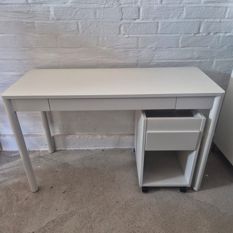 Useamman vuoden käytössä ollut työpöytänä. Pöydän pinta on mielestäni virheetön, muutama käytöstä aiheutunut pieni kolhu löytyy laatikoiden alta. Pöydän koko 49 cm x 102,5 cm ja jalkojen kanssa noin 77 cm korkea. Nouto Naantali Immanen.