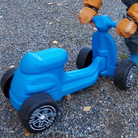 Kiristystä vaativa, mutta ehjä keinuskootteri. Maali halkeillut. Vain nouto.