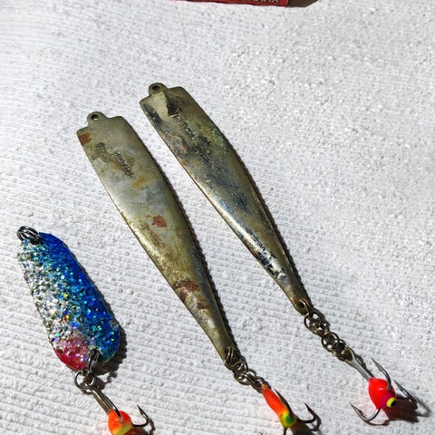Haukilusikoita avoveteen tai kuvassa viritettynä lähinnä hauen pilkkipyyntiin, keskimmäinen näköjään metallitapsin avulla mateelle (yhteishinta 15e+kulut).