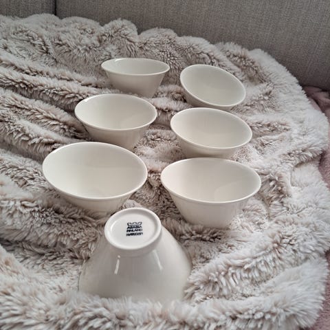 suurempi kulho: 1 kpl halk. 27,5 cm, tilavuus. n. 3,8 l, sisäpuolella ihan pohjassa naarmua lasitteessa (= ottimista), muuten hyväkuntoinen, h. 50,-