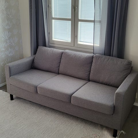 Hyvärunkoinen sohva, verhoilu ehyt, mutta toki käytetty. Yhdestä nurkasta sauma auki. Voisi laittaa uudet istuintoppaukset