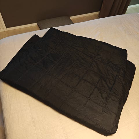 Tikkikuvioitu päiväpeitto, jossa tummanharmaa päällipuoli ja vaalea sisäpuoli.