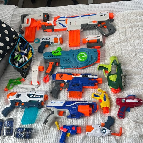 Nerf ja X-Shot leluasepaketti, johon kuuluu useita erilaisia pyssyjä sekä tarvikkeita.