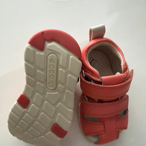 Vauvan tai taaperon sandaalit koossa 19, merkki on Ecco. Materiaali on nahkaa ja pysynyt suhteellisen hyvässä kunnossa, vaaleammissa osissa näkyy hieman kulumaa ja valkoisissa ulkopohjissa näkyy hiekkatahraa tms. värjäytymää. Sisäpohjat siistissä kunnossa. Ks. kunto tarkemmin kuvista.